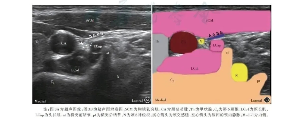 5. 操作方法:在C6椎体水平气管和颈动脉之间,稍加压力用探头把颈动脉推向一侧,显示C6横突及其突出的前后结节,以及被椎前筋膜覆盖位于横突浅面的颈长肌。操作者持22 G、5 cm短斜面穿刺针,依据所选入路选择进针点,采用平面内或平面外引导进针。在超声引导下实时监测穿刺过程,穿刺针依次经过胸锁乳突肌和前斜角肌,然后穿过C6横突前结节和颈静脉之间区域进入直至颈长肌前方、椎前筋膜深面,回抽无血则可注入局麻药。