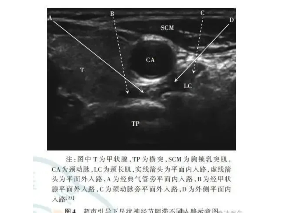 4. 穿刺入路:穿刺入路包括经典气管旁平面内入路、经甲状腺平面外入路、颈动脉旁平面外入路、外侧平面内入路。现今超声引导下SGB多选择在C6或C7水平的气管旁入路和外侧平面内入路,首选外侧平面内入路(图4)。