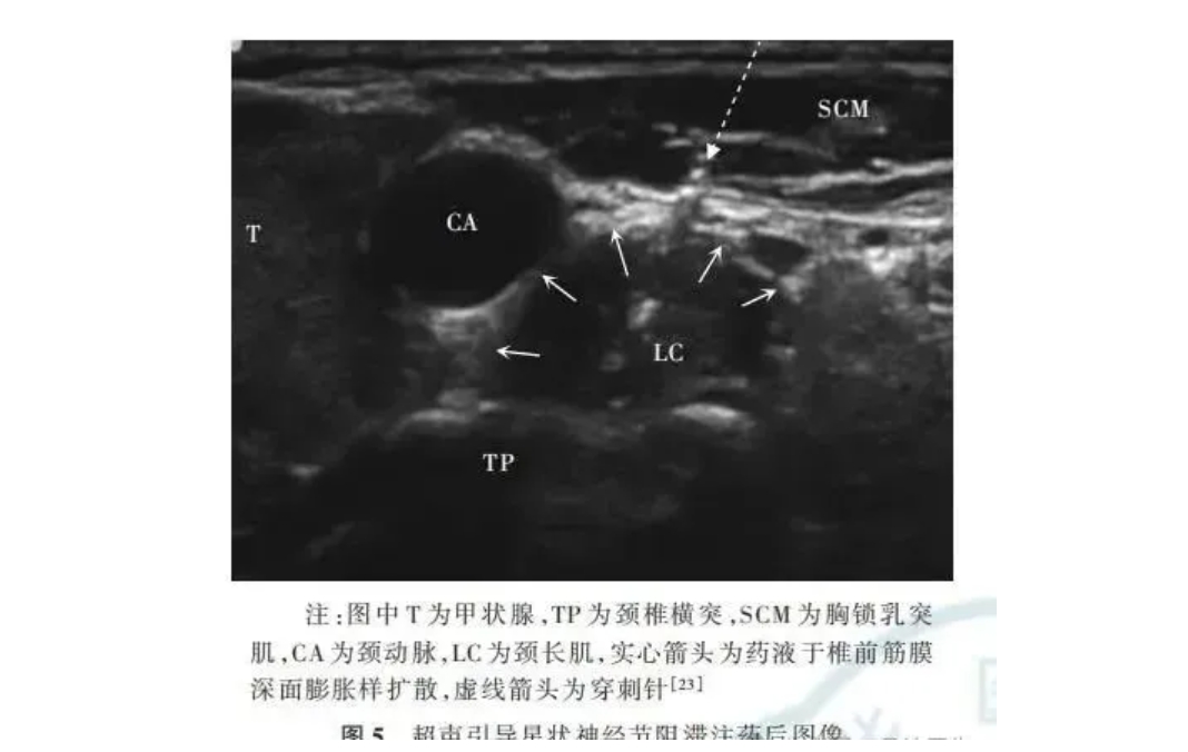 药物需注射在SG附近,通过扩散至神经节发挥作用,要避免直接注射在神经节之内引起损伤、破坏神经节;霍纳综合征是局麻药向头端扩散阻断颈上神经节的结果,如果仅阻滞分布于上臂的颈下神经节则不会出现霍纳综合征。