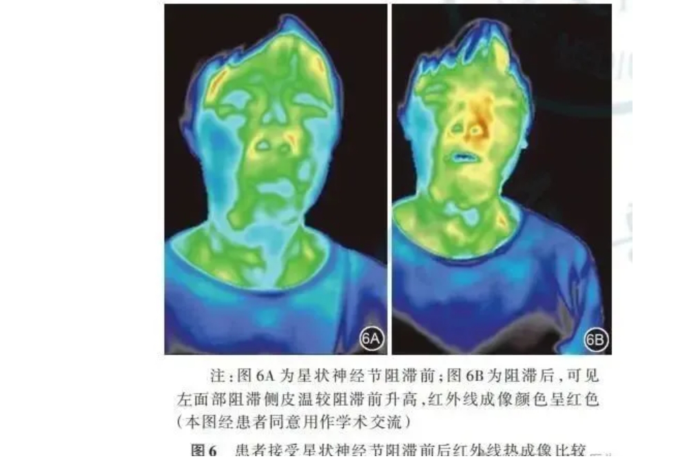 临床常以是否出现霍纳综合征为判断阻滞成功与否的标志。但Chambers和Bhatia研究认为,出现霍纳综合征是眼交感神经被阻滞所致,而眼交感神经的第三级神经元在颈上神经节换元,只有阻滞了颈上神经节才会出现霍纳综合征,仅阻滞SG不会出现霍纳综合征。SG为颈下神经节,被阻滞后同样会出现霍纳综合征的原因可能有:药物扩散至颈上神经节,且由于神经纤维呈现星状散在分布,颈部交感神经呈网络级联状态,故SGB时颈上神经节的神经纤维也可能受影响。由于SG被阻滞后阻滞侧头面部的血管会扩张,血流增加,皮肤温度升高。因此,鄢毅等通过红外线热成像扫描来判断是否阻滞成功,尤其对于面瘫的患者,阻滞后眼睑下垂不明显,通过红外线热成像更为客观(图6)。SGB对于疼痛的缓解程度与疼痛疾病的种类、病程、严重程度有关。由于阻滞了交感神经,可在一定程度上缓解头面部的神经病理性疼痛,对上肢的复杂性区域疼痛综合征(CRPS)Ⅰ型的患者有效。SGB可扩张脑血管,同时增加脑血流量。Gupta等与Pu等。报道,SGB后阻滞侧的颈总动脉和椎动脉的血流量、血流速度、血管横截面积均有不同程度的增加,动脉收缩期血流峰值流速、动脉舒张末期血液流速也均增加。因此,早期用于面神经炎或面神经麻痹的患者有一定的疗效。SGB对心脏功能有一定影响,可改善冠状动脉的收缩及舒张功能。这可能与血浆中的去甲肾上腺素浓度有关。当SG被阻滞后,交感神经受到抑制,血浆中去甲肾上腺素、血管紧张素、皮质醇激素的浓度下降。左右两侧的SG对心脏的效果不同,右侧的节前纤维对心脏的交感神经支配占优势地位。Chen等与Yildirim等研究发现左侧SGB可引起左心室舒张压、心肌耗氧量等明显增加,而右侧可减少心肌的耗氧量。