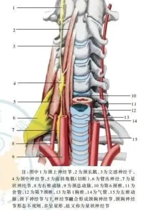 人体两侧颈部的颈动脉鞘后方、颈椎横突前方各有3个颈交感神经节,分别为颈上神经节、颈中神经节和颈下神经节。约80%的人群中,颈下神经节与T1神经节融合形成颈胸神经节,因其形态不规则且多呈星形,故称为星状神经节(SG)。根据Serna-Gutiérrez的研究,部分人群的SG还可能包括T2神经节和颈中神经节。SG的大小约为25 mm×10 mm×5 mm,中心位置通常位于胸膜顶第1肋骨颈水平。若颈下神经节与T1神经节未融合,颈下神经节则常位于C7横突前方,而T1神经节位于第1肋骨颈部前方。SG接收来自上胸段节前交感神经纤维的信号,并在其中交换神经元后发出节后神经纤维,支配头面部、颈项部、上肢及胸内的心脏、大血管、肺、支气管和胸壁等多个器官组织。